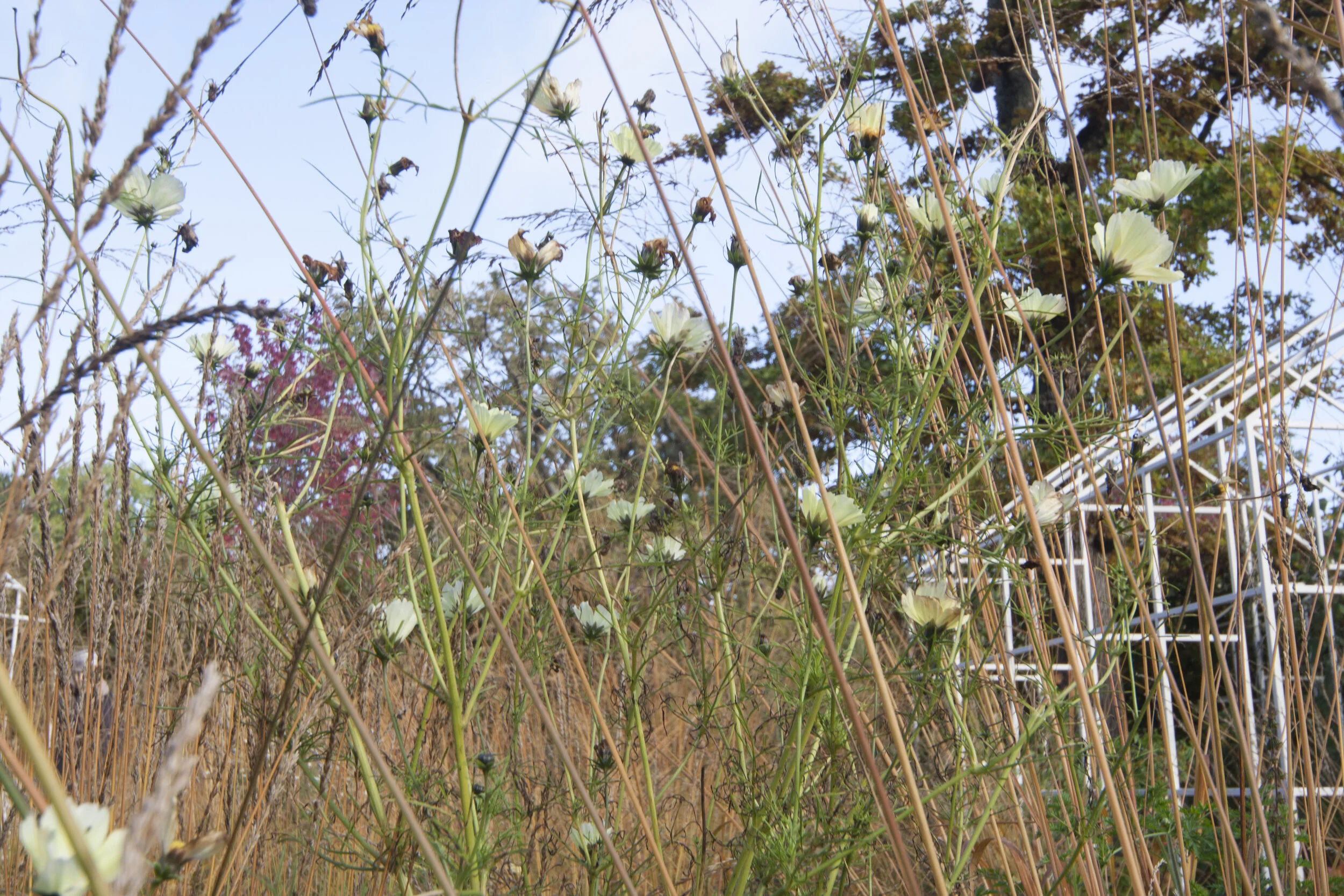 The Edible Garden is a nostalgic memory of the tiny Soviet dacha plots where without much advanced agricultural technologies people gardened not just for fun, but to survive through the years of deficit. It’s been quite a while since survival gardening has been abandoned at least around our country’s capital and the vegetable beds and greenhouses have mostly been replaced with lawns and flowers. Yet we see that this type of gardening will make a comeback both due to an urge to grow your own organic vegetables and the looming economic crisis. The old dacha plots may be overgrown now and taken over by nature, but they are a distant memory that is suddenly very alive. In our garden five glasshouses are partially filled with vegetables, and partially taken over by the Russian meadow planting. All the plants belong to plant communities of Nikolo-Lenivets Landart Park 250 km South of Moscow. The matrix of blue moorgrass Molinia caerulea is filled with forbs such as Verbascum, Salvia, Geraniums, Trifolium, Achillea, Agrimonia, etc. The meadow is dotted with masses of Cosmos bipinnatus – a beloved annual Soviet dacha plant. The greenhouses are overtaken by the meadow, but in some of them you can still see raspberries or beans, or a random tomato plant. Weathered furniture pieces are also of the same period. The vintage chairs made in Checkoslovakia invite you to sit down and feel the nature taking over.