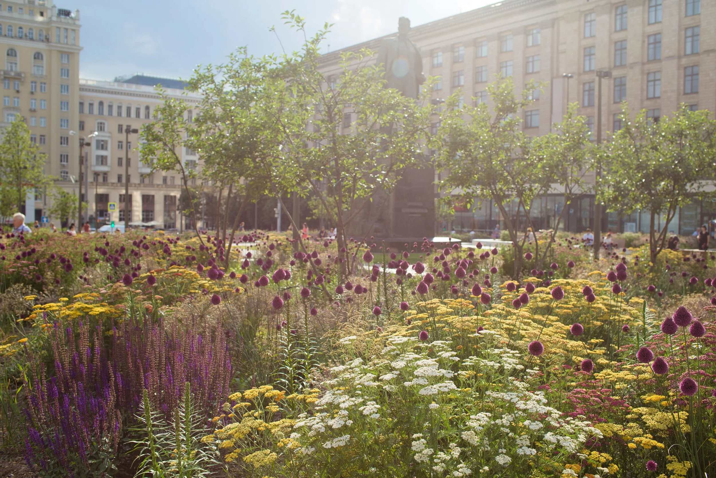 Triumfalnaya Square is located at the crossing of Moscow’s main street Tverskaya with the Garden Ring. It was designed by the Soviet architect Chechulin in 1958, but has become overridden with chaotic parking. The new design by Buromoscow created green spaces with seating areas around Vladimir Mayakovsky statue. Bigger trees were planted along the Garden Ring and ornamental crabapples - Malus ‘Red Sentinel’ - are scattered around the meadow planting. We knew from the start that no proper maintenance will be taking place, so the planting had to be robust. A matrix of golden Deshampsia was chosen for the grass’s ability to grow both in the sun and shade, it’s early emergence in spring and drought tolerance. In nature tufted hair grass often grows in wet meadows, but it is resilient enough to grow in dry conditions. Irises sp., Salvias sp. and Allium chrisophii provide color in June followed by Achillea millefolium and Allium spherocehalon in July and Liatris spicata and Panicum virgatum ‘Rotstrahlbusch’ in August. Autumn and winter interests come from the grasses and crabapples. The intense colors of Achillea were not part of the design intent. The idea was to use delicate pale yellow variety ‘Mondpagode’ to match the towering Peking hotel building. But here the contractors’ decision to buy Summer Pastels’ Mix instead turned out to be blessing in disguise.