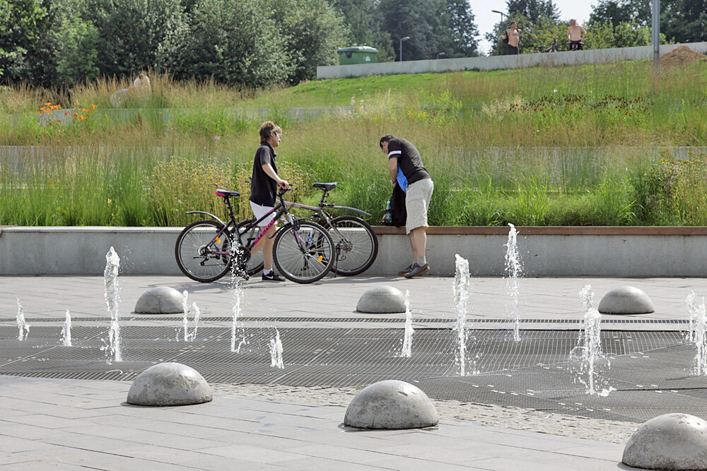 A former busy riverside road it was closed in 2013 and turned into a park with a formal plaza of lime tree grove, a huge fountain in front of the New Tretyakov Gallery, and more naturalistic adjacent planting.